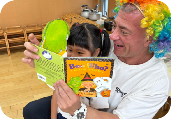 ニコラ先生と一緒に歌や絵本、会話遊びを通して英語に触れ合います。友だちと学ぶからこそ生まれるコミュニケーションの楽しさがあふれる時間です。