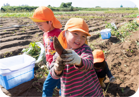 園でさつまいもの水栽培から始まり、プランターに植え替えて生長を学びます。自分たちで育てたさつまいもを収穫してから、加賀野菜で有名な五郎島金時の畑へ掘りに行っています。掘ったさつまいもはクッキングで使用し、さつまいもパーティーを開いて楽しみます。