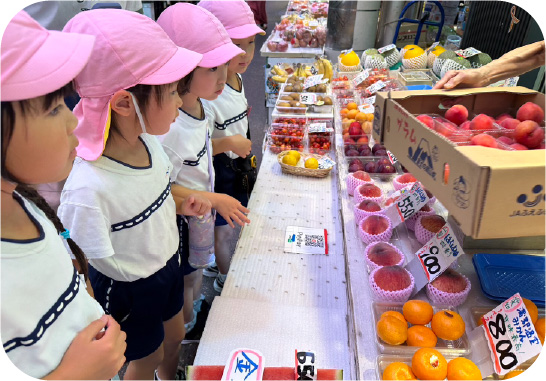 ジュースの元となるシロップ作りを3・4・5歳児で行っています。金沢で有名な近江町市場が近くに有り、年長組さんが材料を買いに行き、縦割りグループで味の違うシロップを作っています。毎日一生懸命に瓶を回して出来上がったシロップでジュース屋さんを開き、他のクラスの友だちや職員、保護者の方々に振る舞っています。